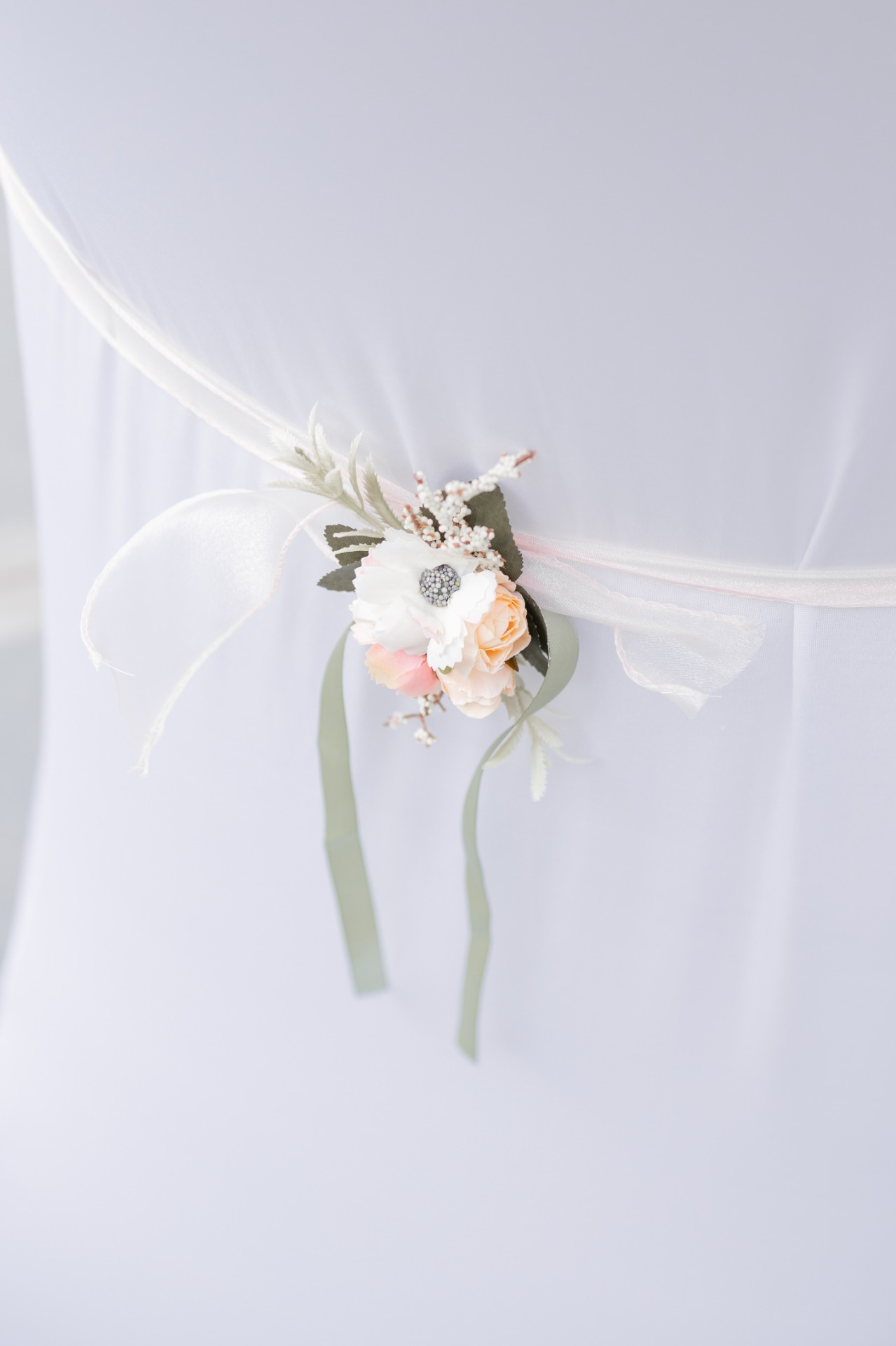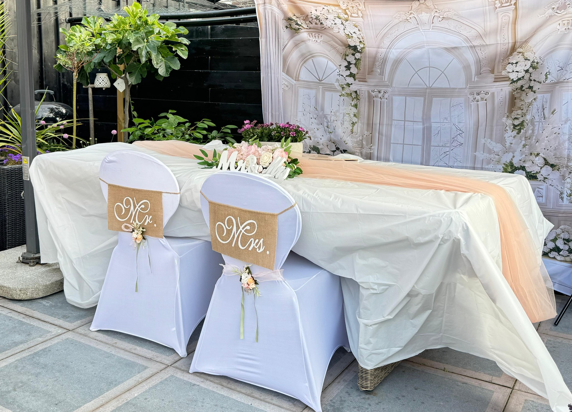 Witte stoelhoezen met of zonders Mr & Mrs en met of zonder strik met bloemetje te huur/ te koop