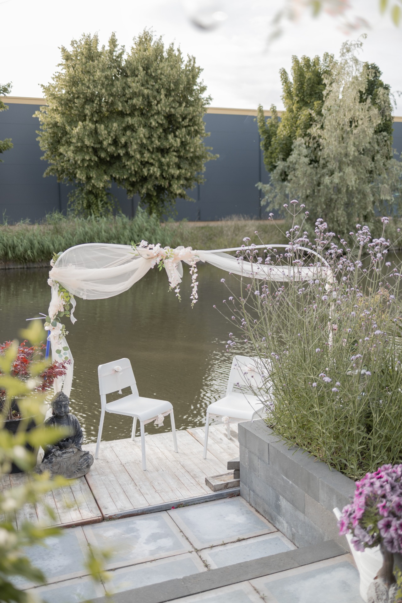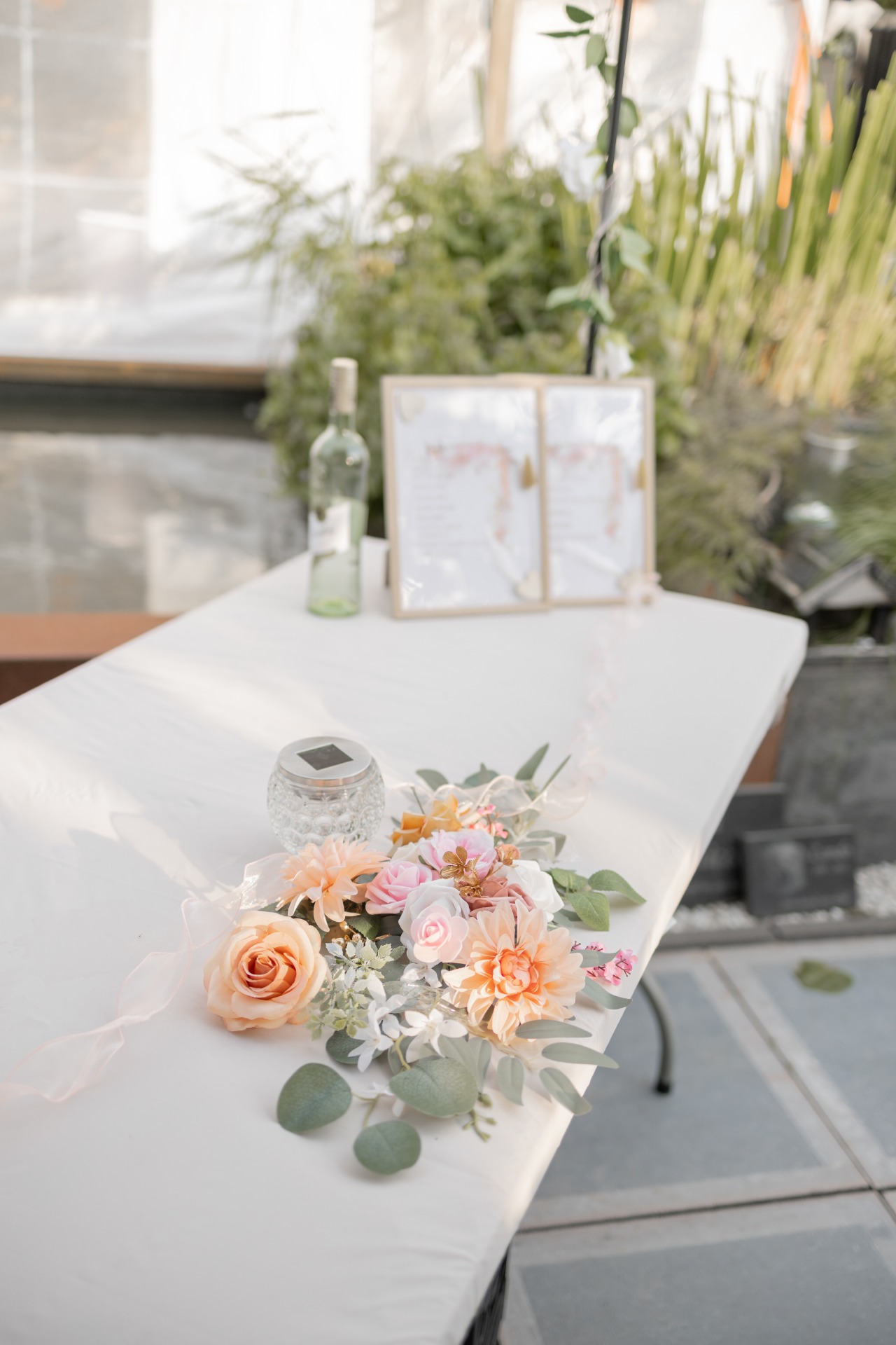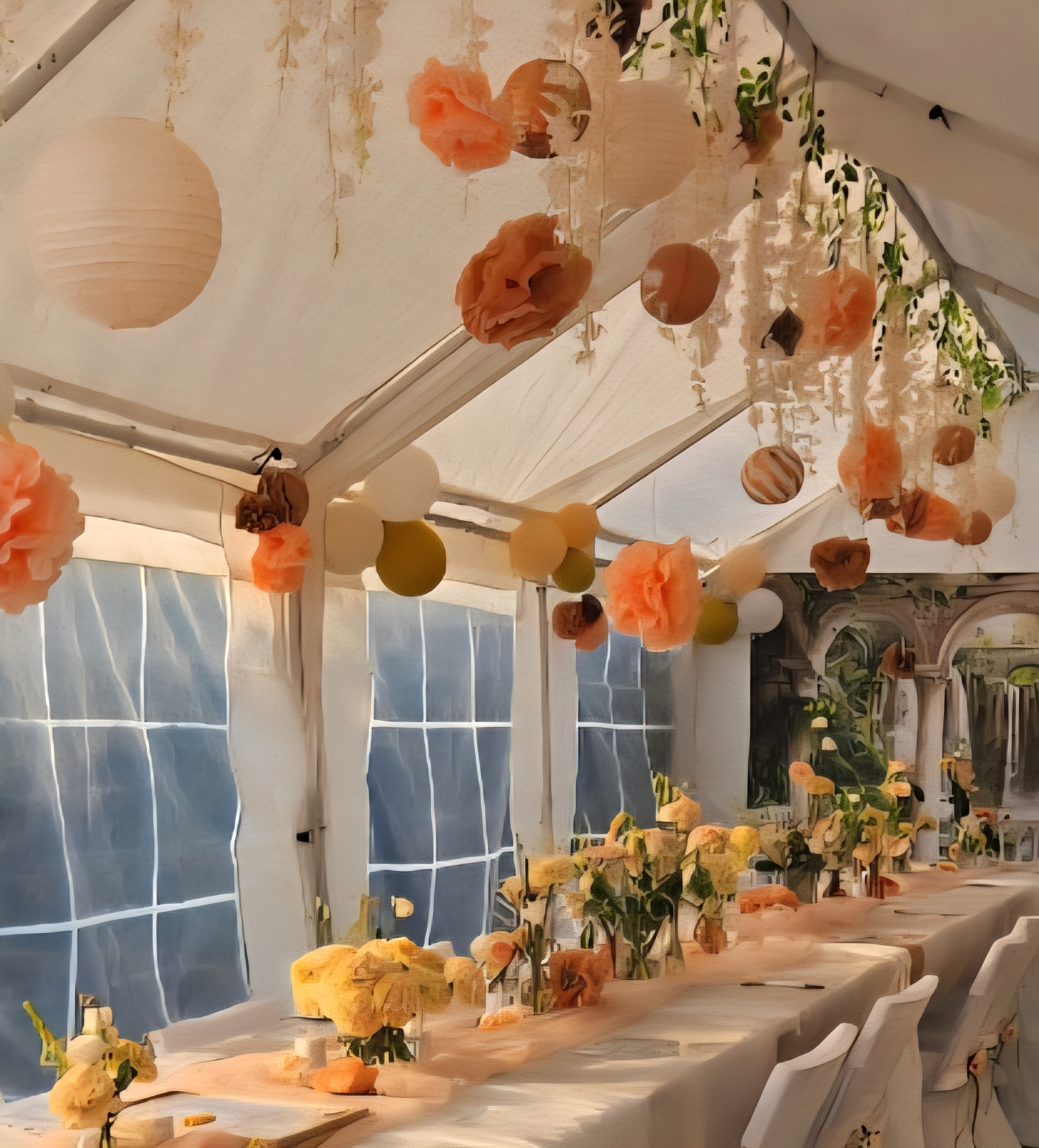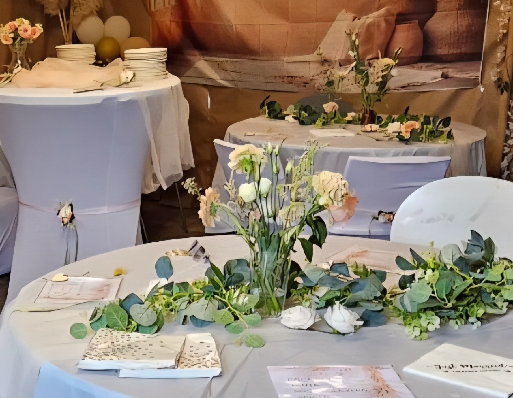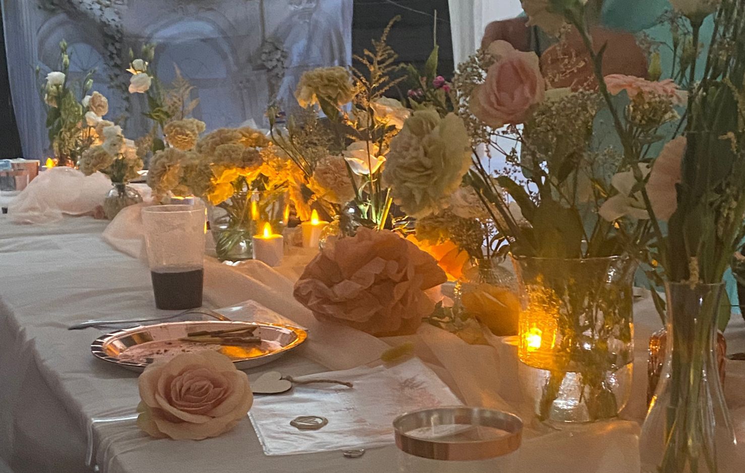 Tafeldecoratie zoals bordjes (wegwerp te koop),kaarsjes op batterijen met timer (te huur), vaasjes met verse bloemen, tule en Kunstbloemen te huur