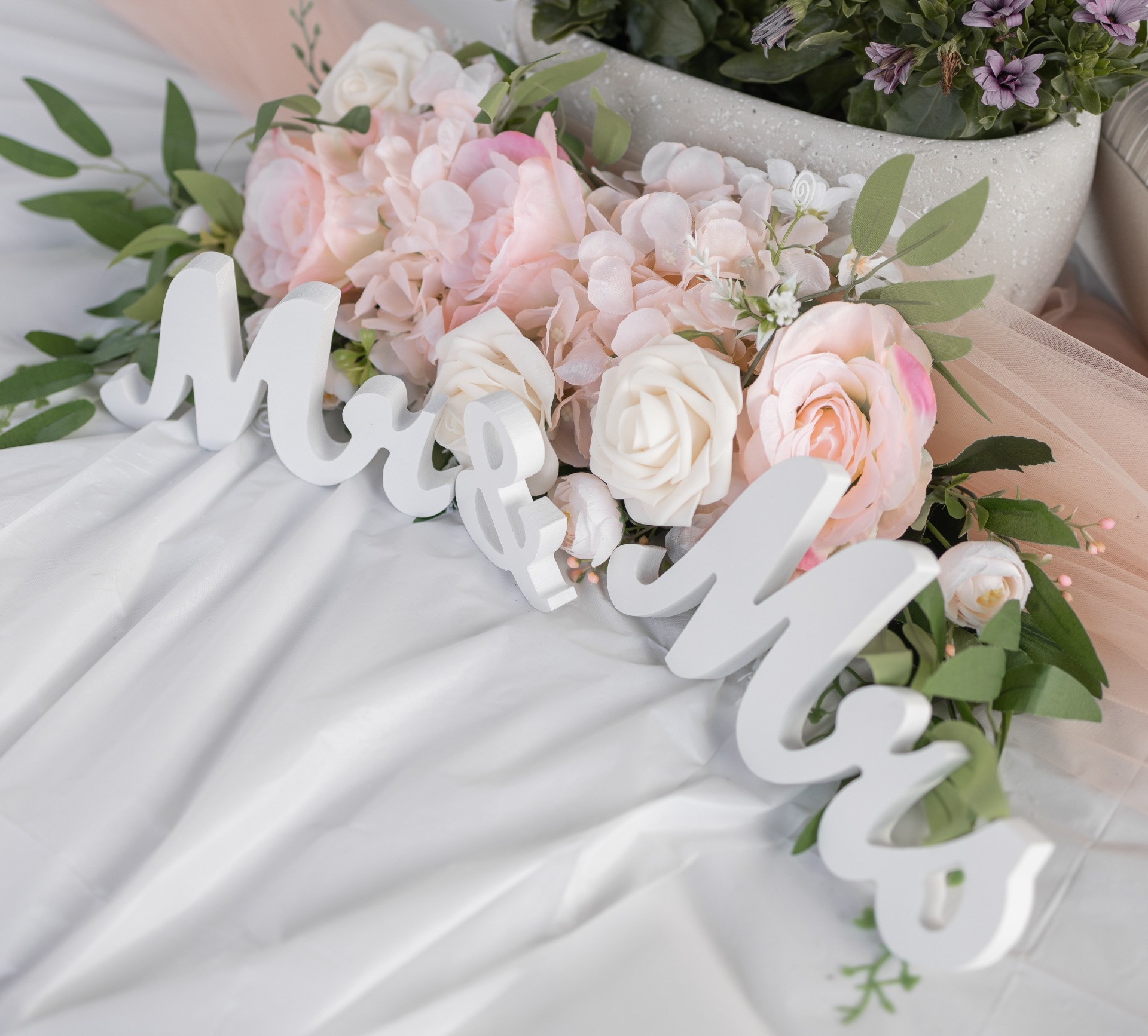 Mr & Mrs houten tekst met of zonder Kunstbloemen te huur of te koop